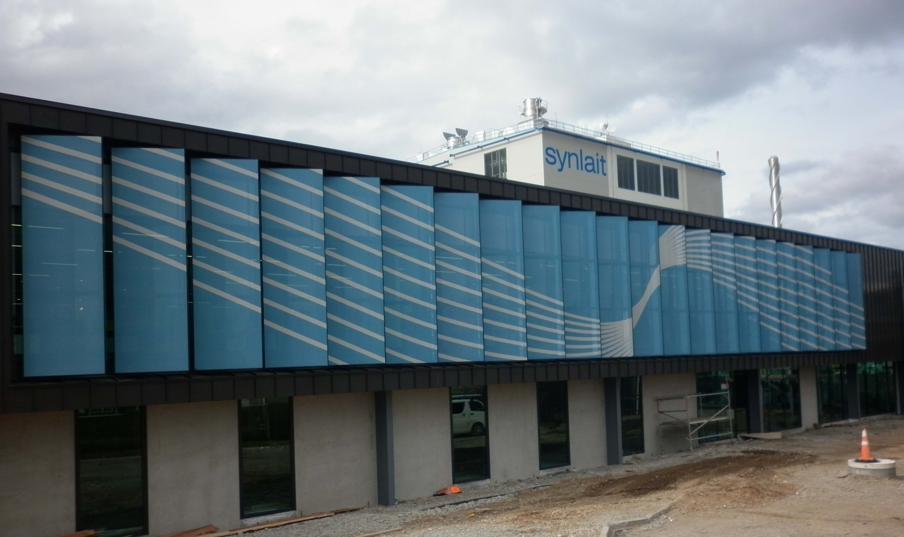 The White face is designed for inkjet printing. The Black face is towards the interior of the building and allows excellent views from the inside to give a one-way vision effect. Facades can be designed for promotion of a business and to provide sun protection to reduce internal glare and reduce energy costs associated with air conditioning. This project in New Zealand featured the company logo across the front of their new office development.